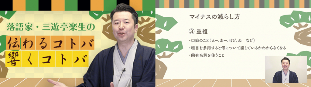 この度販売を開始したコースは、自身のコミュニケーションスキルに不安がある、スピーチやプレゼンが苦手というビジネスパーソンの方に向けて、芸歴24年の落語家・三遊亭楽生先生の話し方のノウハウを学ぶことで、構成力・伝達力などコミュニケーションスキルの向上を期待できる内容です。