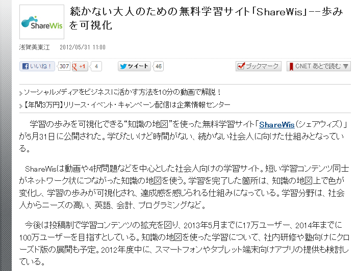 メディア CNET Japanに掲載されました 2012年5月31日 弊社サービスShareWisがCNET Japanに掲載されました。 誠にありがとうございます。 続かない大人のための無料学習サイト「ShareWis」—歩みを可視化