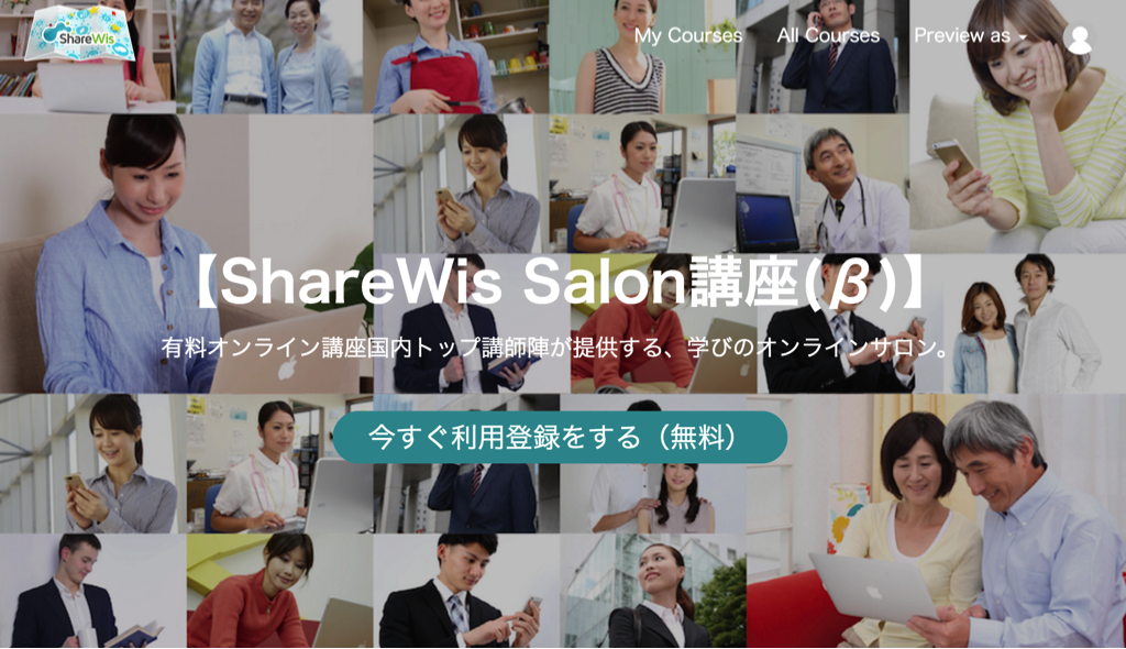 5/13(金)より、新サービスのベータ版「ShareWis Salon講座(β)〜有料オンライン講座国内トップ講師陣による、学びのオンラインサロン〜」を公開いたしました。 ShareWis Salon講座(β)〜有料オンライン講座国内トップ講師陣による、学びのオンラインサロン〜 ShareWisSalon講座 【第一弾として、世界で9万人、国内1.3万人のオンライン受講生(有料)に教える、Masaaki Hatano氏によるSalon講座(β)の提供開始】 MaSalon Masalon_thum00_b2 Masaaki Hatano氏の活動については、エン・ジャパンの「CAREER HACK(キャリアハック)」にも紹介されています。 キャリア ハック Masaaki Hatano 【ShareWis Salon講座 提供コンテンツ】 1.オンラインサロン ・SNSのグループ(非公開・招待制)で週に数回、講師からの講義や情報(動画・テキスト・ドキュメント)の限定投稿から学べます ・メンバーからの公開質問に対しての講師による回答や、メンバー同士のディスカッションもあります。 2.リアルタイムサロン ・毎週定時の約30分間、 SNSのグループに講師がオンラインの状態になり、サロンメンバーからの質問にリアルタイムで回答をしたり、チャットやドキュメントでその場で講義をします。 3.交流会(オフ会) ・不定期でセミナーや懇親会が開催されます。 ・講師がゲストを呼んだり、懇親会で人脈、ネットワークが広がります。 4.サロンWeb カリキュラムや動画群やレポートのアーカイブサイトです。さらに、講師が他の講座で提供している動画レクチャもサロンメンバー専用にセレクトした内容で提供されます。 【今後のSalon講座ラインナップについて】 有料オンライン講座トップ講師陣による、学びのオンラインサロン講座が続きます。 投資についての定評ある講座と数千名の受講生を抱える佐々木徹氏が、プロップファーム経営の吉中 晋吾氏とタッグを組んで送る、「ゴールド・オイル・通貨」のSalon講座や話題のビットコインの使い方、投資の考え方やブロックチェインの技術、グローバルな潮流について共同講師と提供するSalon講座も企画中です。 ShareWis Salon講座(β)〜国内有料オンライン講座トップ講師陣による、学びのオンラインサロン〜
