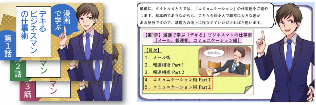 この度販売を開始したコースは、「デキる」ビジネスマンが実践している、普段の仕事では中々気付けない基礎的な仕事術を習得できる講座です。実際のビジネスシーンを題材とした、漫画動画で楽しく学習することができます。単なる知識習得に留まらず、実務に活かせるオンライン学習の世界を体験してみてください。